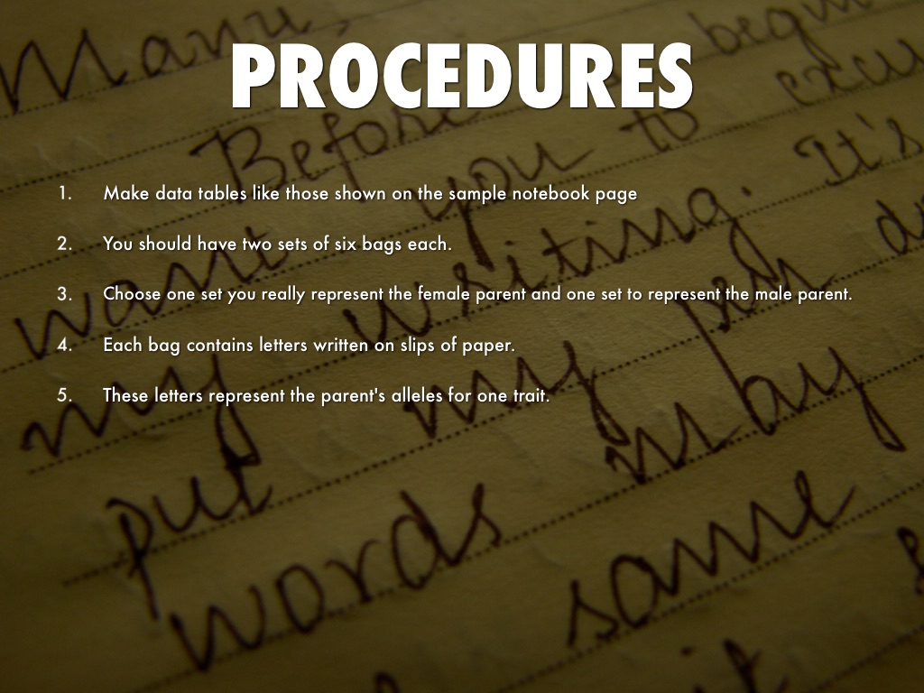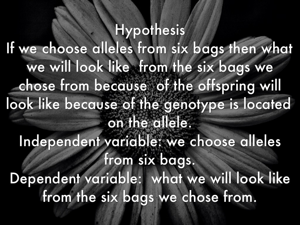 Hypothesis If we choose alleles from six bags then what we will look like from the six bags we chose from because of the offspring will look like because of the genotype is located on the allele. Independent variable: we choose alleles from six bags. Dependent variable: what we will look like from the six bags we chose from.