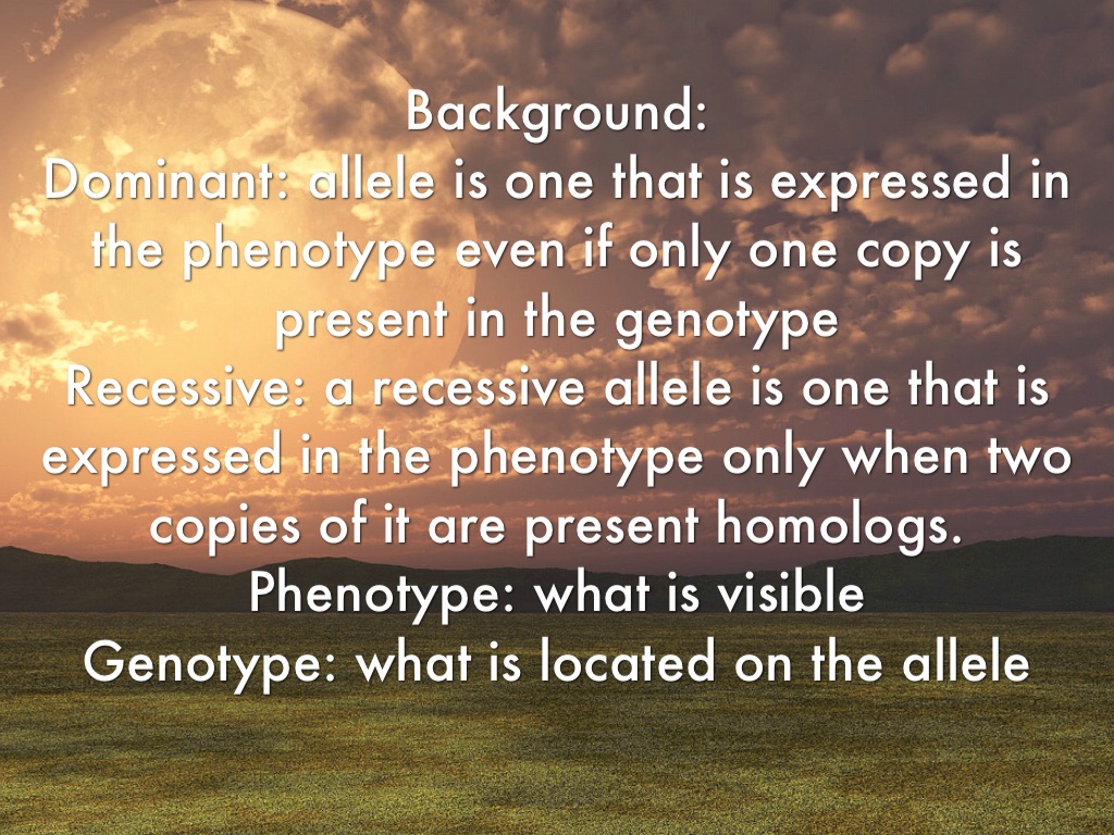 Background: Dominant: allele is one that is expressed in the phenotype even if only one copy is present in the genotype Recessive: a recessive allele is one that is expressed in the phenotype only when two copies of it are present homologs. Phenotype: what is visible Genotype: what is located on the allele