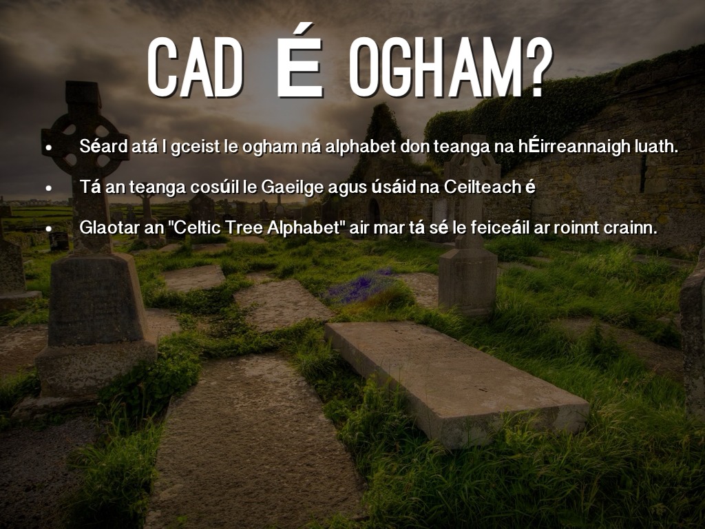 Séard atá I gceist le ogham ná alphabet don teanga na hÉirreannaigh luath.