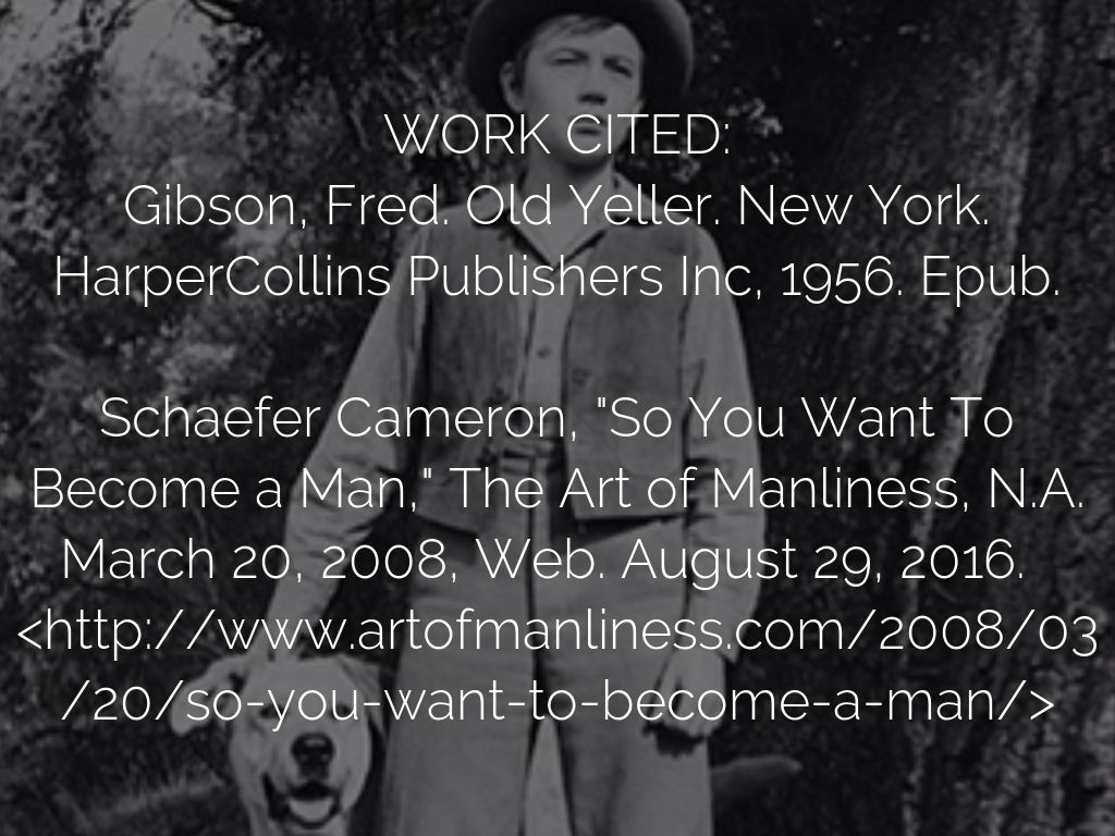 During the course of the book "Old Yeller" I saw Travis, the main character of the book, transform from a boy to a man. Maturing into an adult/ man takes a lot more then just simply what you own or have in life. Woodrow T. Wilson once said "No man has ever risen to the real stature of spiritual manhood until he has found that it is finer to serve somebody else than it is to serve himself."