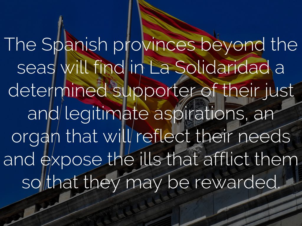 The Spanish provinces beyond the seas will find in La Solidaridad a determined supporter of their just and legitimate aspirations, an organ that will reflect their needs and expose the ills that afflict them so that they may be rewarded.