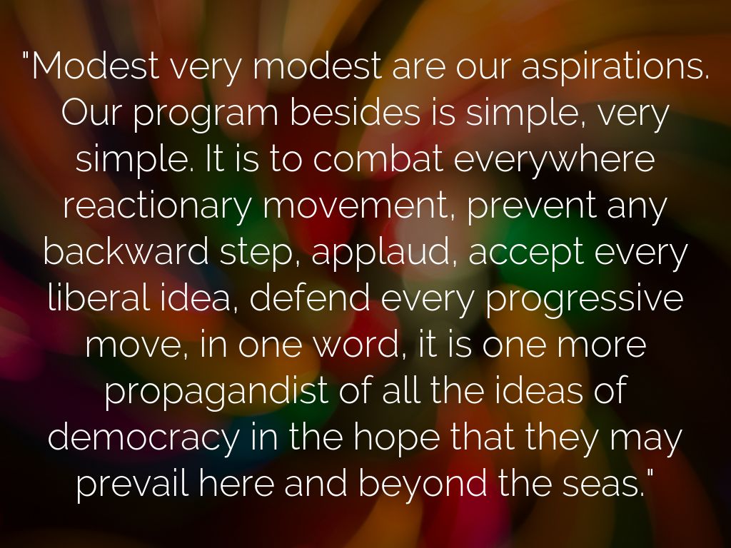 "Modest very modest are our aspirations. Our program besides is simple, very simple. It is to combat everywhere reactionary movement, prevent any backward step, applaud, accept every liberal idea, defend every progressive move, in one word, it is one more propagandist of all the ideas of democracy in the hope that they may prevail here and beyond the seas."