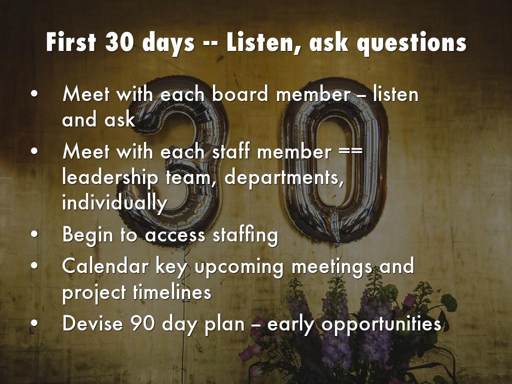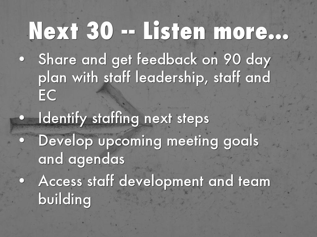 Meetings with staff - listen, learn, plan a fun event for team building with senior leadership