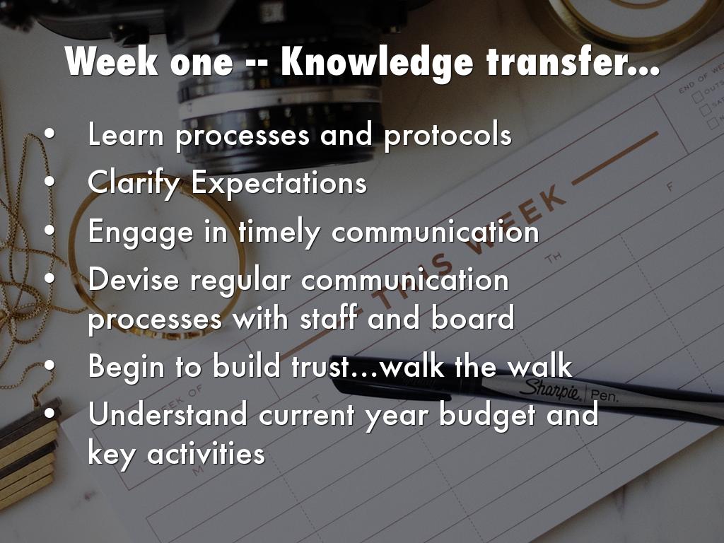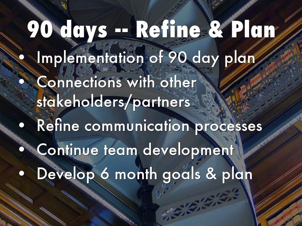 Devise 90 day plan -- communication with stakeholders, partners, WEF etc.