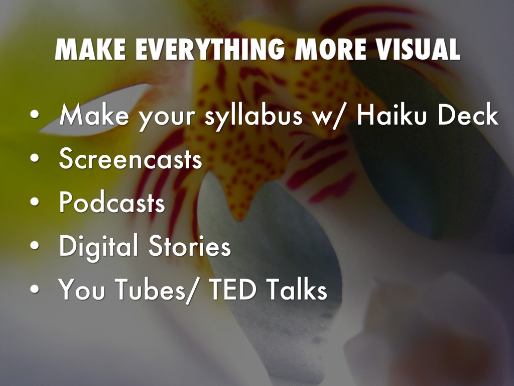 A brainstormed list for adding heightened interest to classes for online students. Created by Sandy Brown Jensen