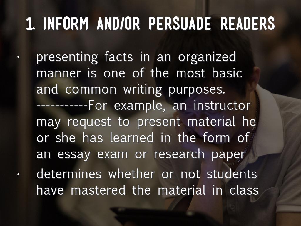 presenting facts in an organized manner is one of the most basic and common writing purposes. -----------For example, an instructor may request to present material he or she has learned in the form of an essay exam or research paper
