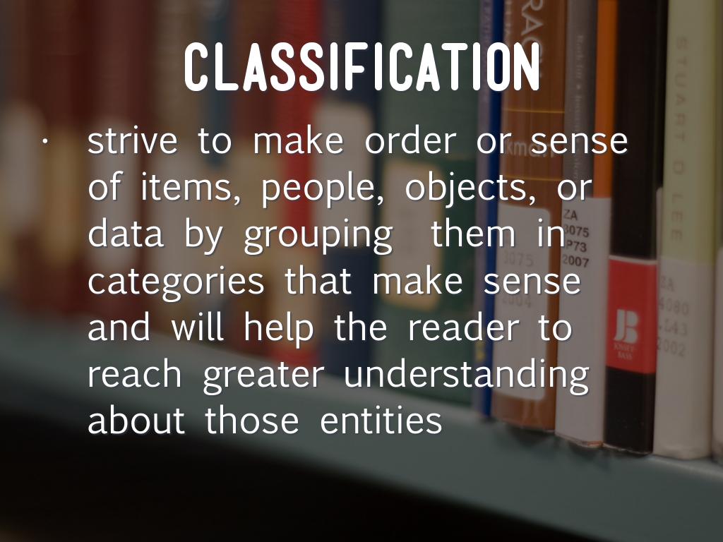 strive to make order or sense of items, people, objects, or data by grouping them in categories that make sense and will help the reader to reach greater understanding about those entities