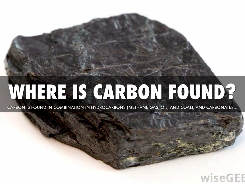 CARBON IS FOUND IN COMBINATION IN HYDROCARBONS (METHANE GAS, OIL, AND COAL), AND CARBONATES (LIMESTONE AND DOLOMITE).