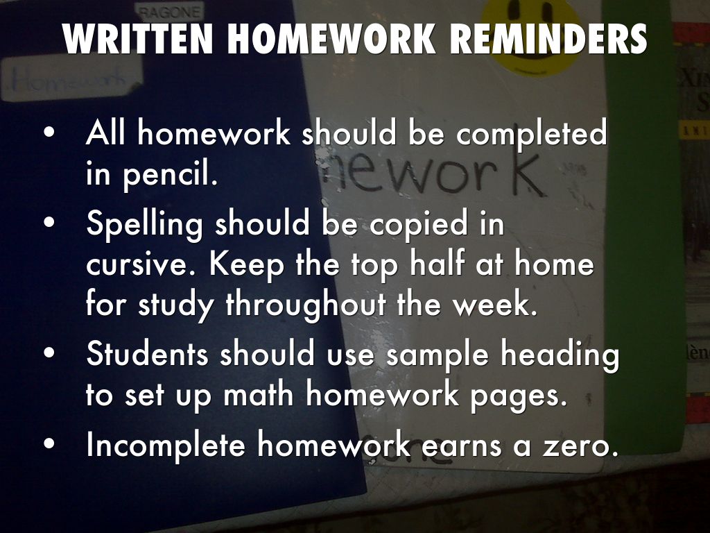 Spelling should be copied in cursive. Keep the top half at home for study throughout the week.
