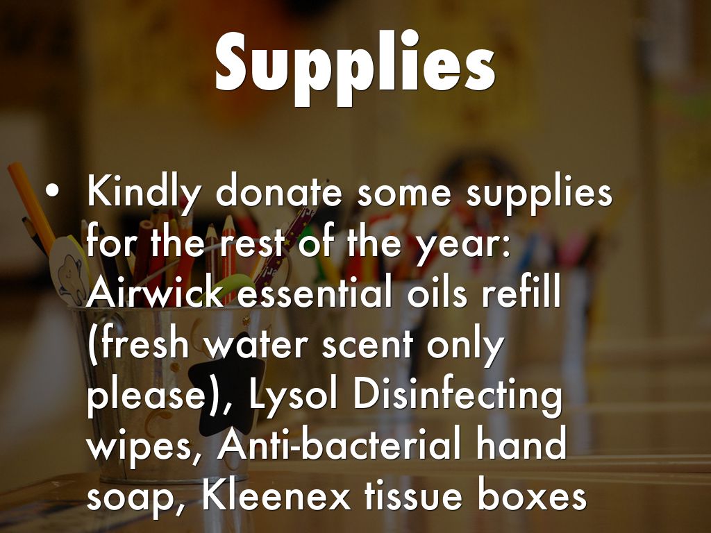 Kindly donate some supplies for the rest of the year: Airwick essential oils refill (fresh water scent only please), Lysol Disinfecting wipes, Anti-bacterial hand soap, Kleenex tissue boxes