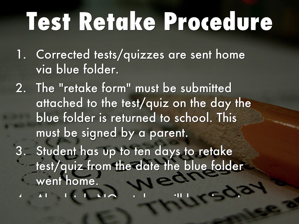 The "retake form" must be submitted attached to the test/quiz on the day the blue folder is returned to school. This must be signed by a parent.