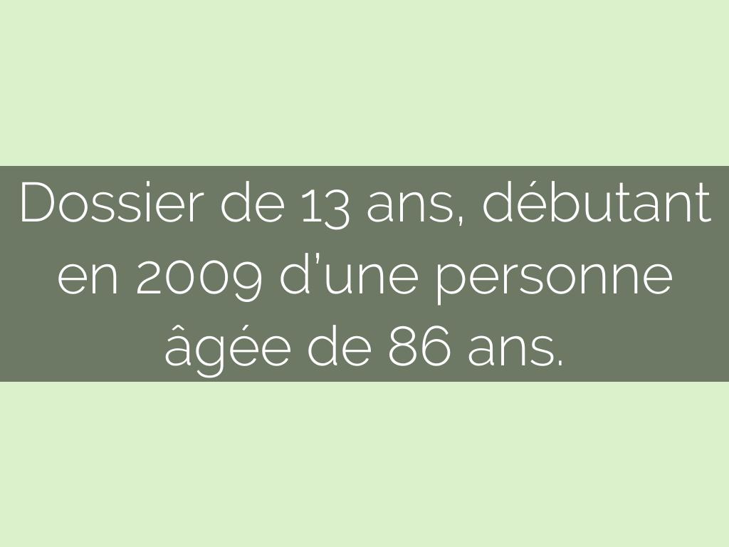 Dossier de 13 ans, débutant en 2009 d’une personne âgée de 86 ans.