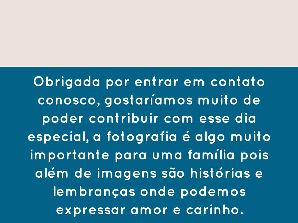 Obrigada por entrar em contato conosco, gostaríamos muito de poder contribuir com esse dia especial, a fotografia é algo muito importante para uma família pois além de imagens são histórias e lembranças onde podemos expressar amor e carinho.