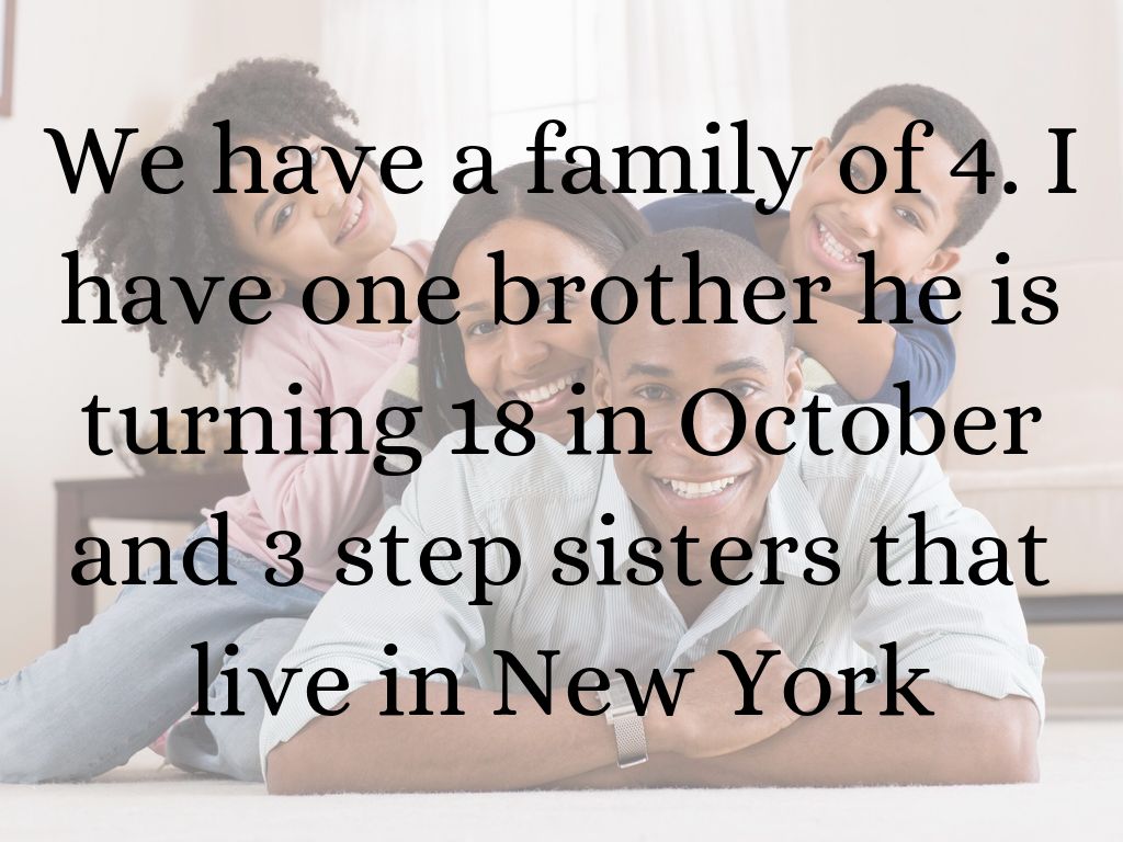 We have a family of 4. I have one brother he is turning 18 in October and 3 step sisters that live in New York