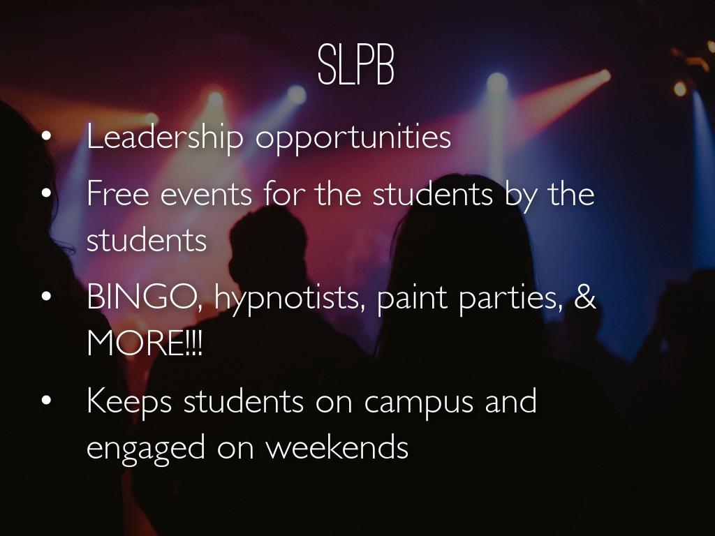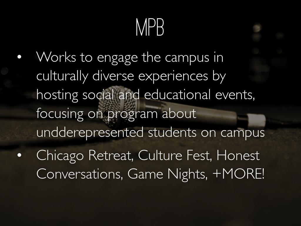 • Works to engage the campus in culturally diverse experiences by hosting social and educational events, focusing on program about undderepresented students on campus
