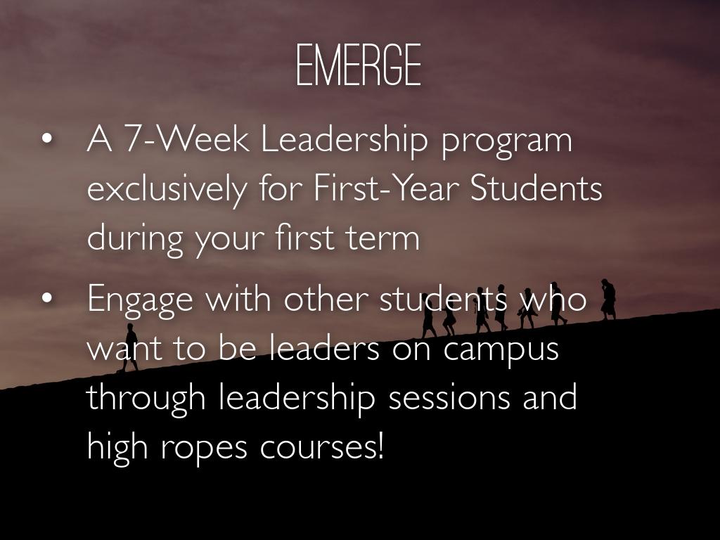 • Engage with other students who want to be leaders on campus through leadership sessions and high ropes courses!