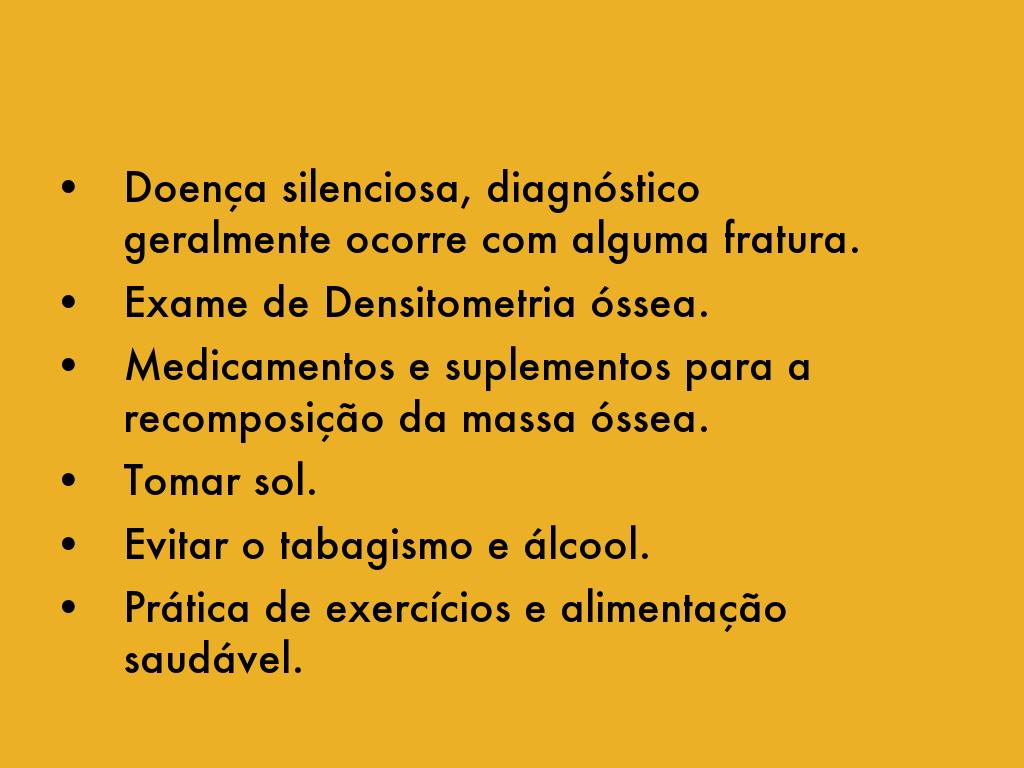 - Doença silenciosa, diagnóstico geralmente ocorre com alguma fratura.