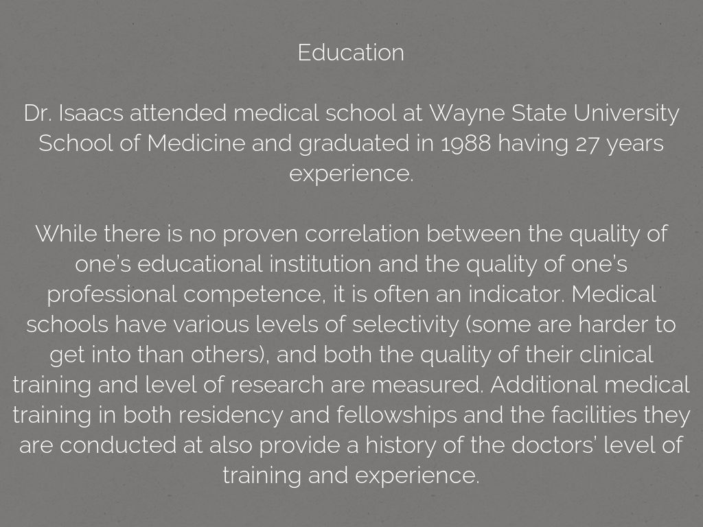 Dr. Isaacs attended medical school at Wayne State University School of Medicine and graduated in 1988 having 27 years experience.