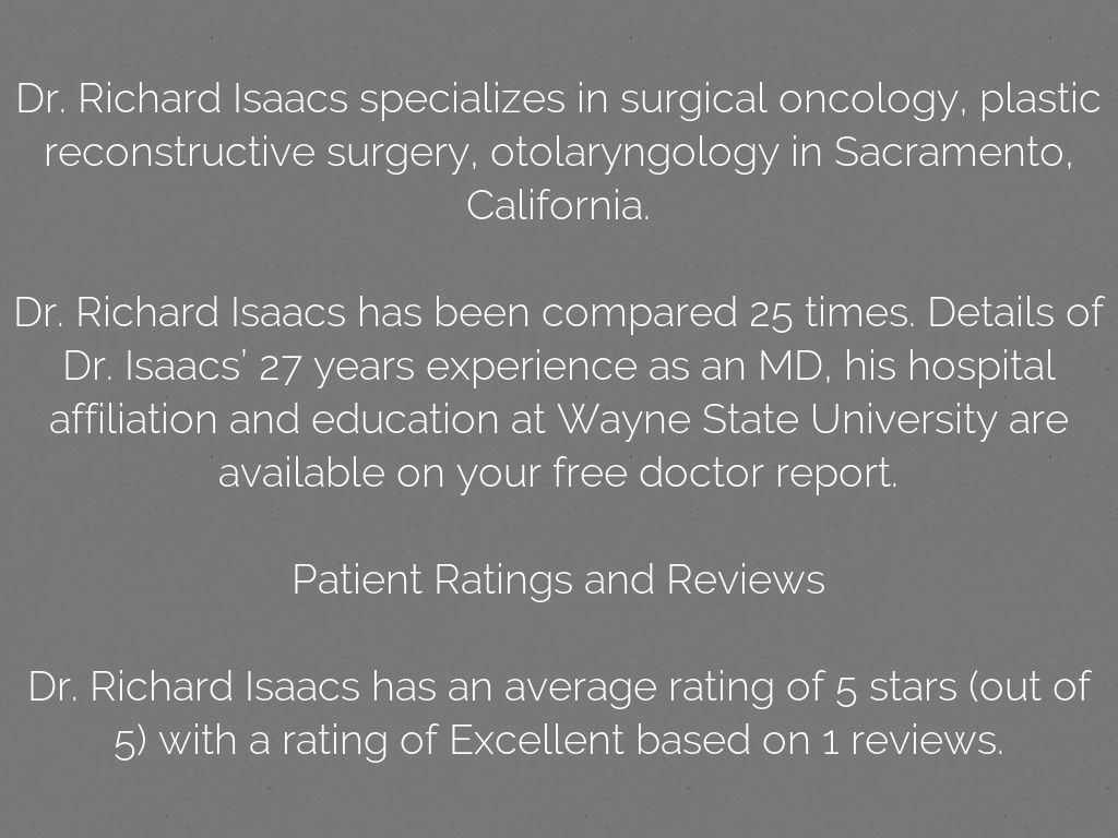 Dr. Richard Isaacs specializes in surgical oncology, plastic reconstructive surgery, otolaryngology in Sacramento, California.