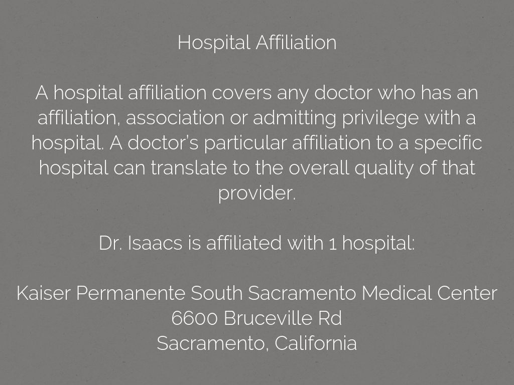 A hospital affiliation covers any doctor who has an affiliation, association or admitting privilege with a hospital. A doctor’s particular affiliation to a specific hospital can translate to the overall quality of that provider.