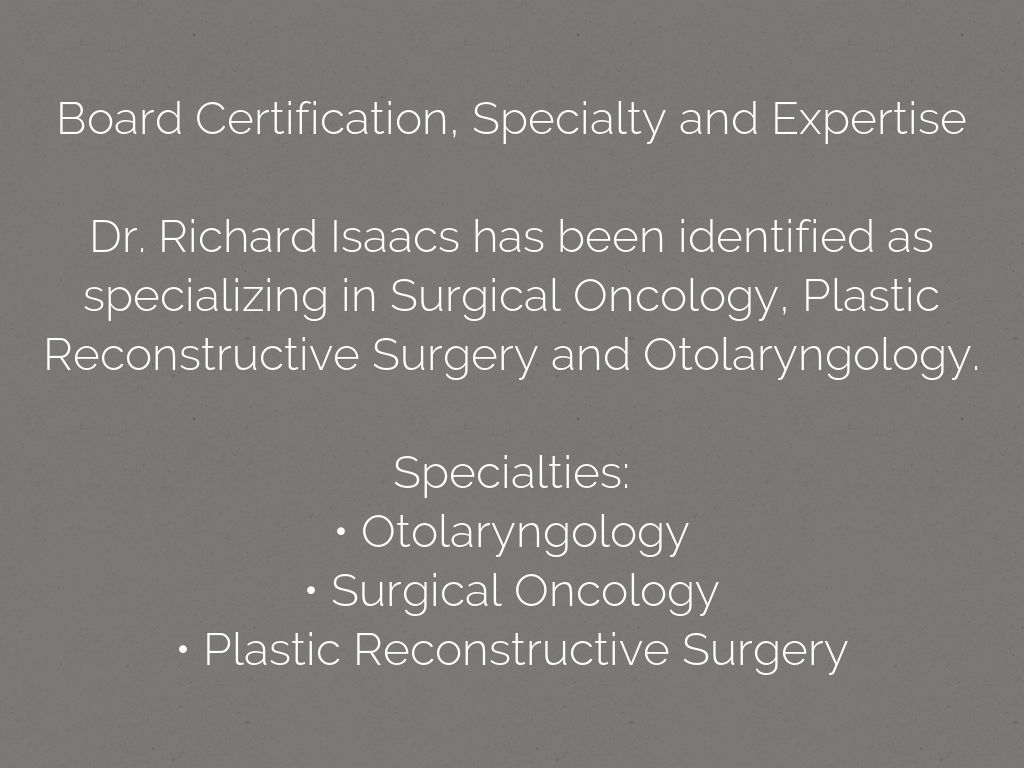 Dr. Richard Isaacs has been identified as specializing in Surgical Oncology, Plastic Reconstructive Surgery and Otolaryngology.