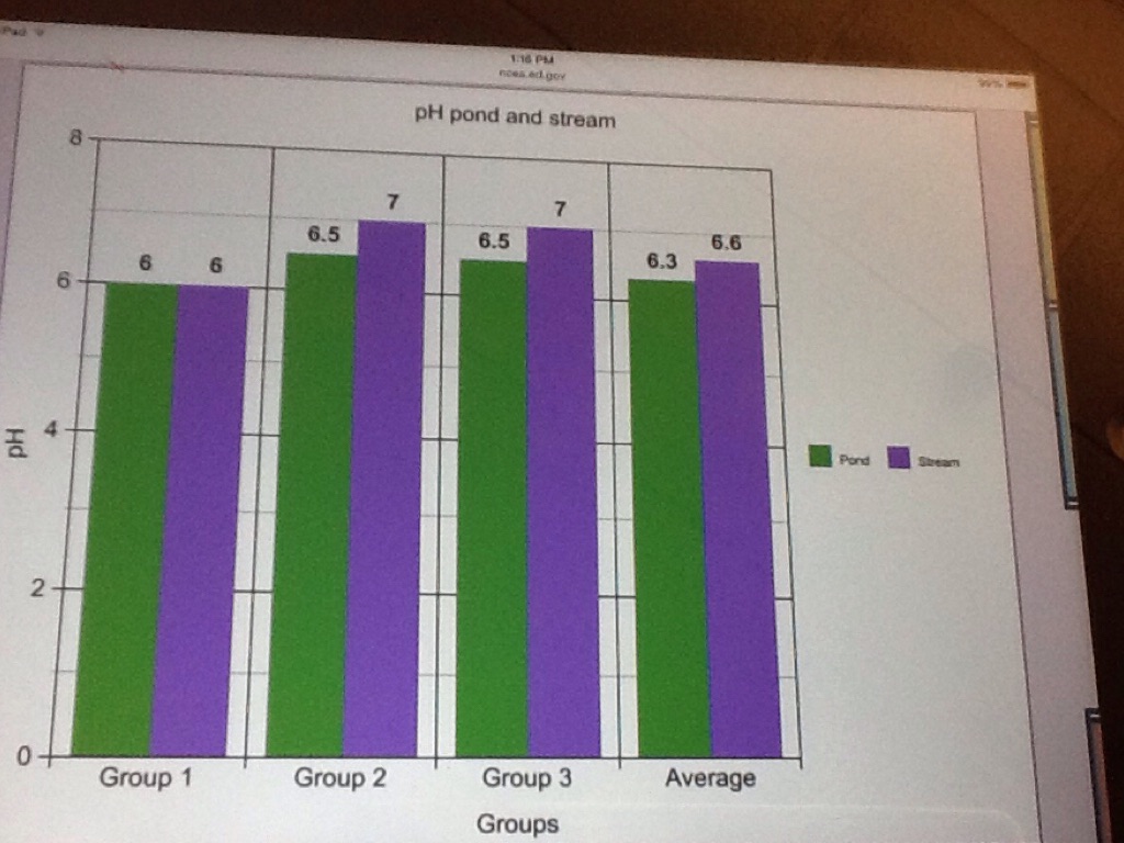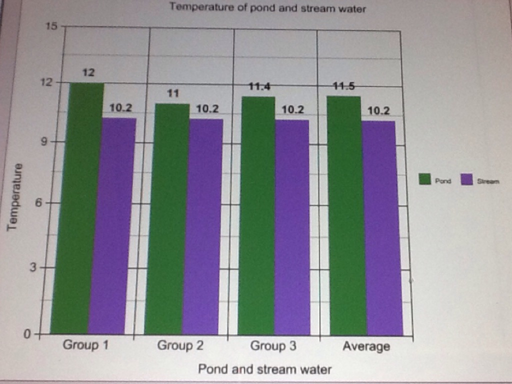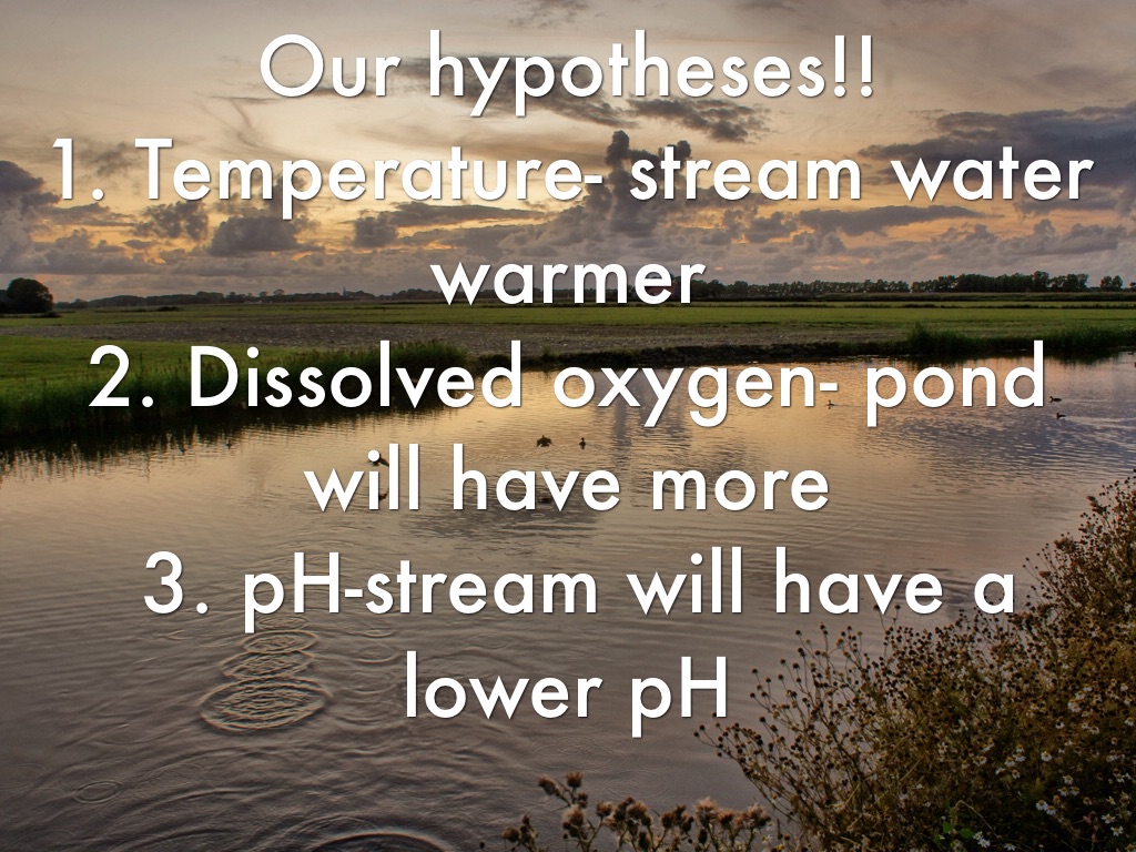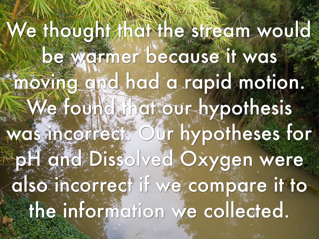 We thought that the stream would be warmer because it was moving and had a rapid motion. We found that our hypothesis was incorrect. Our hypotheses for pH and Dissolved Oxygen were also incorrect if we compare it to the information we collected.