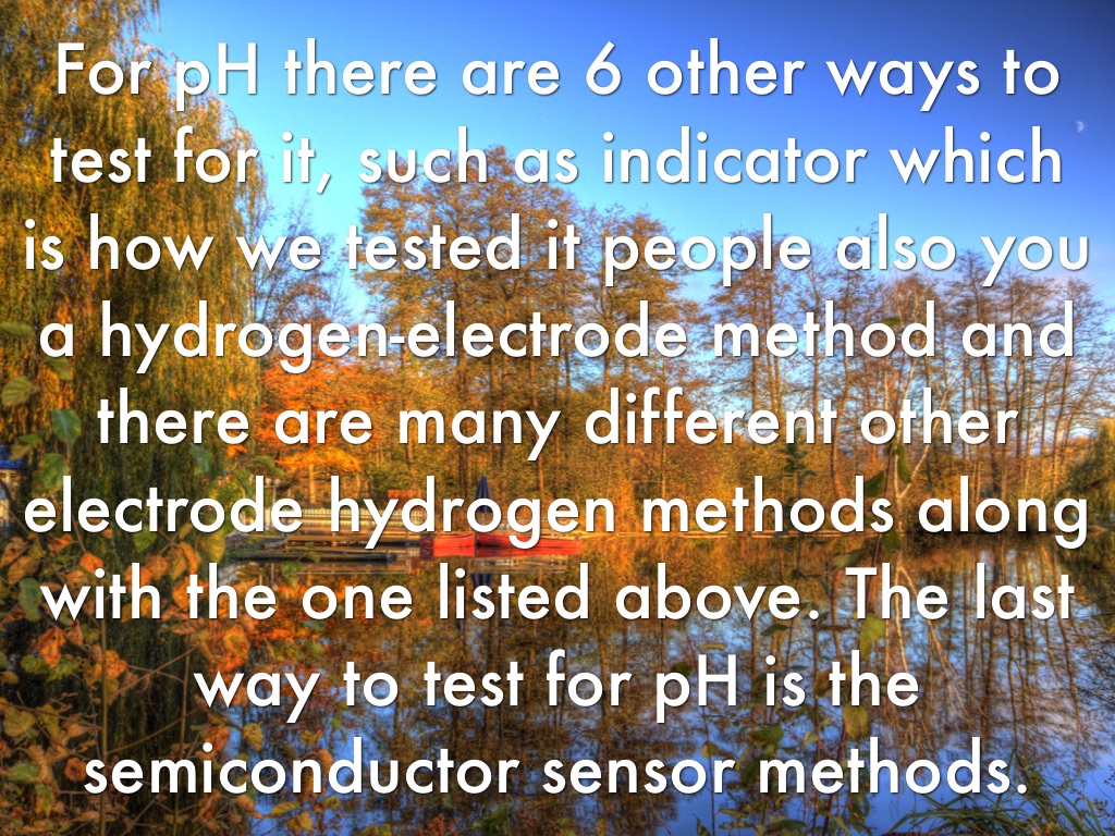 For pH there are 6 other ways to test for it, such as indicator which is how we tested it people also you a hydrogen-electrode method and there are many different other electrode hydrogen methods along with the one listed above. The last way to test for pH is the semiconductor sensor methods.