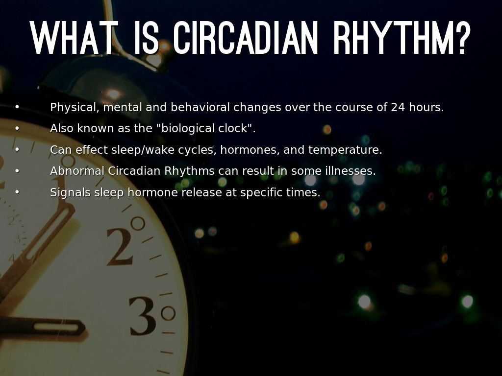 Circadian Rhythm is the process in which individuals physical, mental, and behavioral state changes throughout a period of 24 hours.
