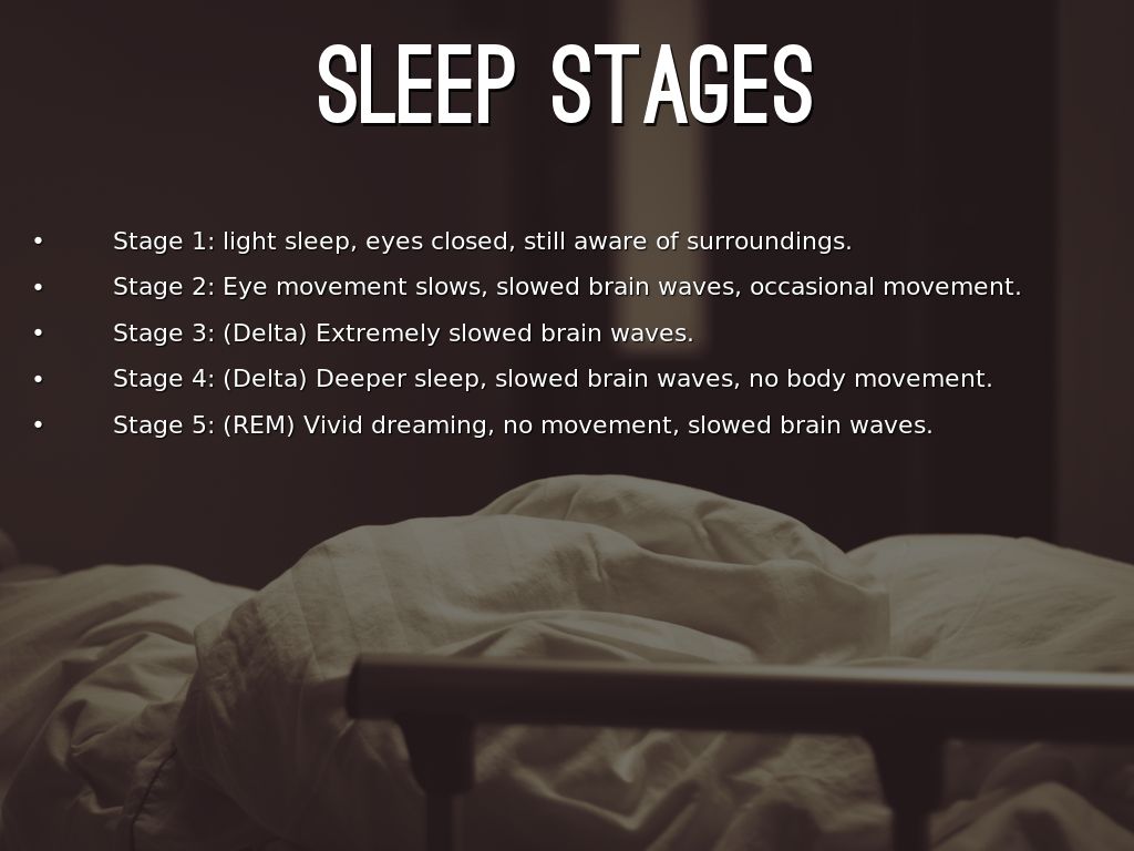 • Stage 3: (Delta) Extremely slowed brain waves.