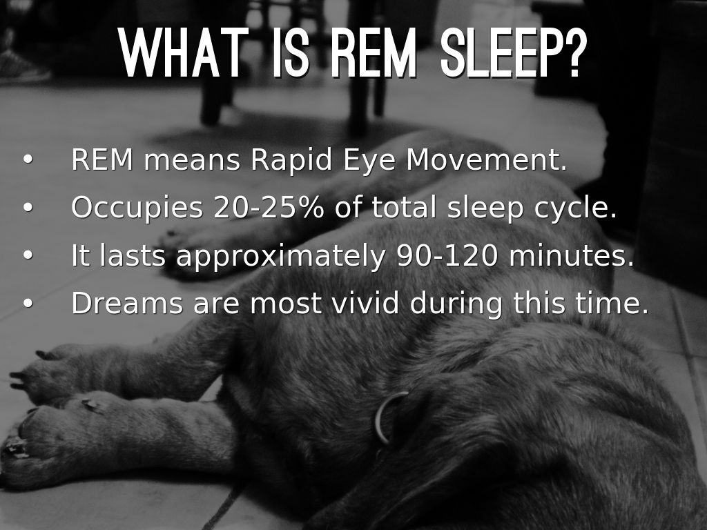 • Stage 5: (REM) Vivid dreaming, no movement, slowed brain waves.