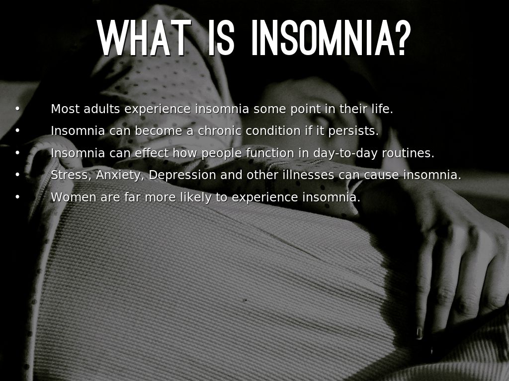 • Stress, Anxiety, Depression and other illnesses can cause insomnia.