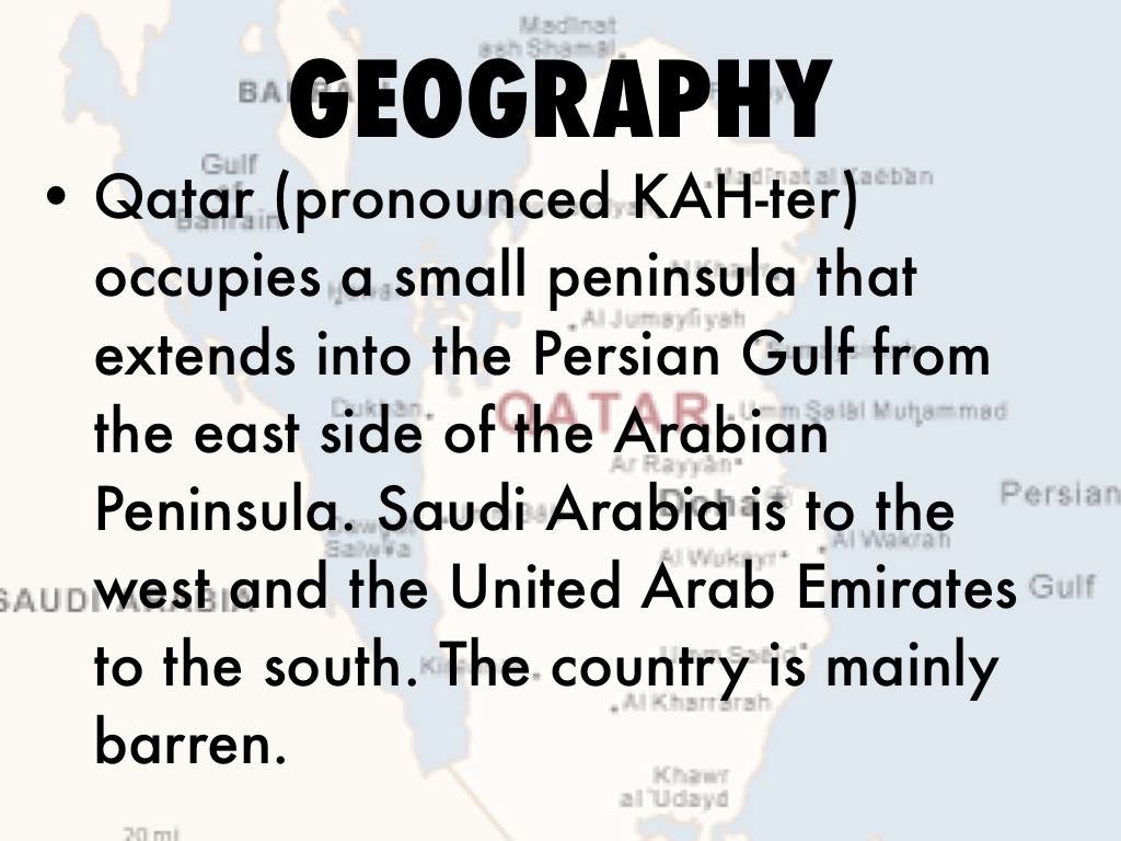 Qatar (pronounced KAH-ter) occupies a small peninsula that extends into the Persian Gulf from the east side of the Arabian Peninsula. Saudi Arabia is to the west and the United Arab Emirates to the south. The country is mainly barren.