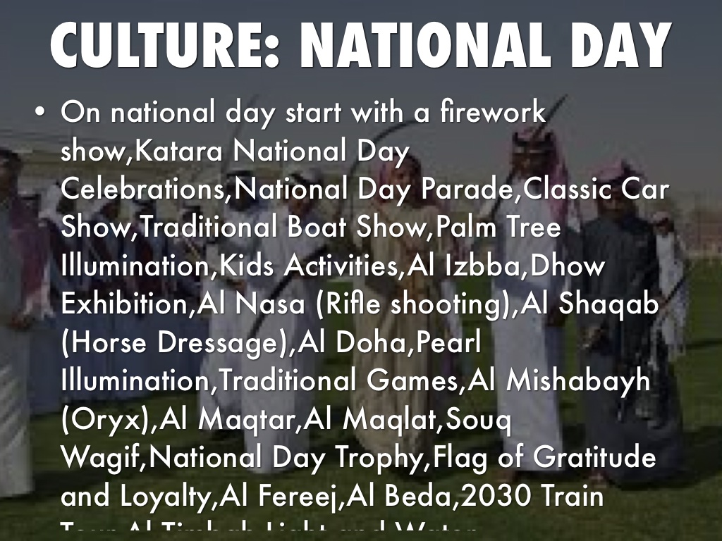 On national day start with a firework show,Katara National Day Celebrations,National Day Parade,Classic Car Show,Traditional Boat Show,Palm Tree Illumination,Kids Activities,Al Izbba,Dhow Exhibition,Al Nasa (Rifle shooting),Al Shaqab (Horse Dressage),Al Doha,Pearl Illumination,Traditional Games,Al Mishabayh (Oryx),Al Maqtar,Al Maqlat,Souq Wagif,National Day Trophy,Flag of Gratitude and Loyalty,Al Fereej,Al Beda,2030 Train Tour,Al Timbah,Light and Water Projections,Qatar Museums National Day Celebration,Live Falconry Demonstration,Weekly Live Demonstrations of Handicrafts.