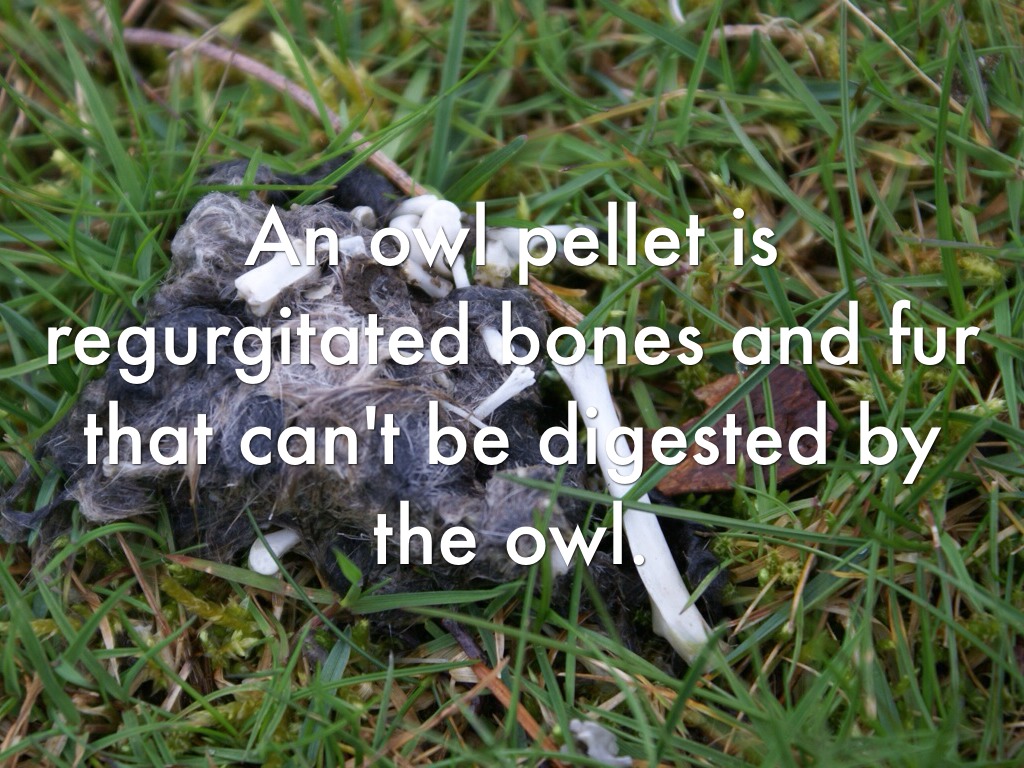 An owl pellet is regurgitated bones and fur that can't be digested by the owl.