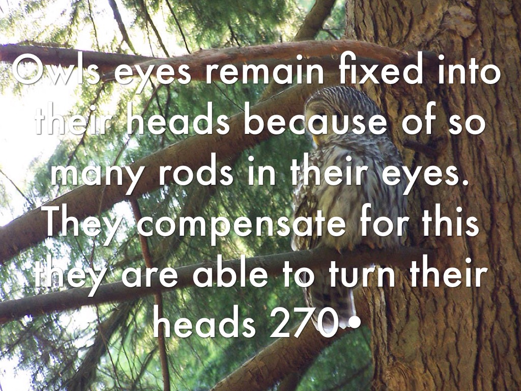 Owls eyes remain fixed into their heads because of so many rods in their eyes. They compensate for this they are able to turn their heads 270•