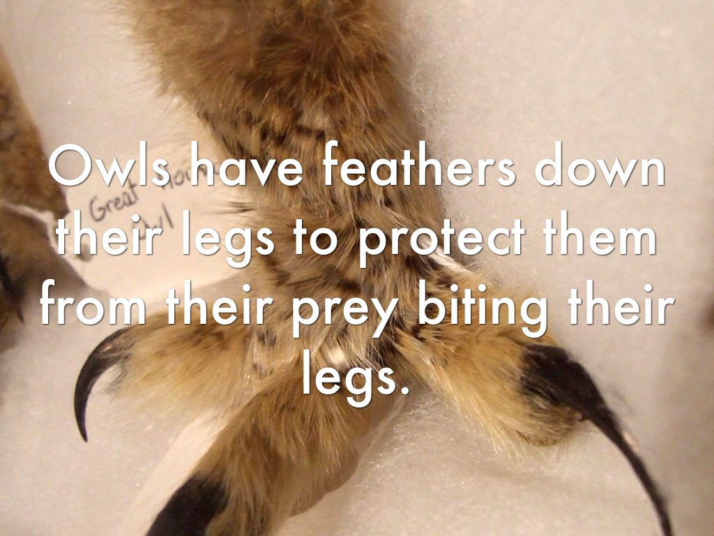 Owls have feathers down their legs to protect them from their prey biting their legs.