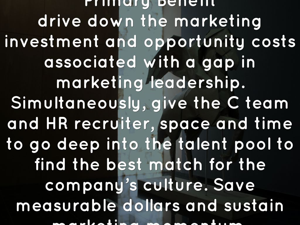 Primary Benefit drive down the marketing investment and opportunity costs associated with a gap in marketing leadership. Simultaneously, give the C team and HR recruiter, space and time to go deep into the talent pool to find the best match for the company’s culture. Save measurable dollars and sustain marketing momentum.