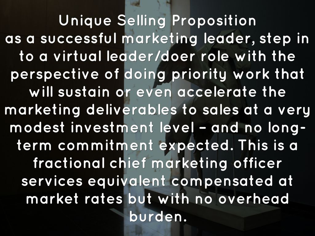Unique Selling Proposition as a successful marketing leader, step in to a virtual leader/doer role with the perspective of doing priority work that will sustain or even accelerate the marketing deliverables to sales at a very modest investment level – and no long-term commitment expected. This is a fractional chief marketing officer services equivalent compensated at market rates but with no overhead burden.