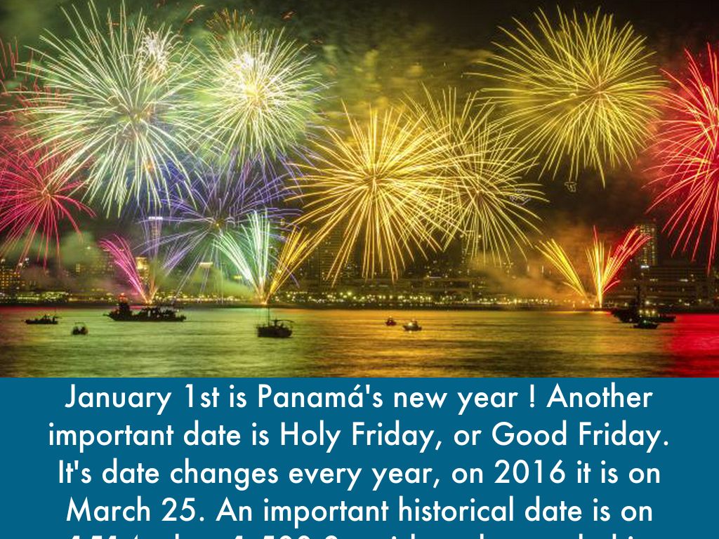 January 1st is Panamá's new year ! Another important date is Holy Friday, or Good Friday. It's date changes every year, on 2016 it is on March 25. An important historical date is on 1514 when 1,500 Spanish settlers settled in Panamá.
