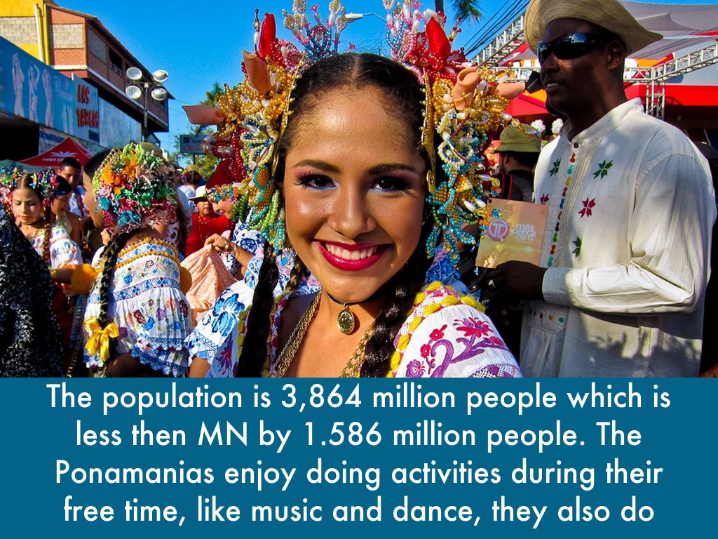 The population is 3,864 million people which is less then MN by 1.586 million people. The Ponamanias enjoy doing activities during their free time, like music and dance, they also do art.
