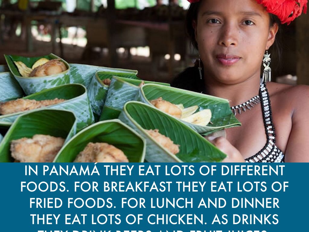 IN PANAMÁ THEY EAT LOTS OF DIFFERENT FOODS. FOR BREAKFAST THEY EAT LOTS OF FRIED FOODS. FOR LUNCH AND DINNER THEY EAT LOTS OF CHICKEN. AS DRINKS THEY DRINK BEERS AND FRUIT JUICES, COCONUT WATER, AND COFFEE .
