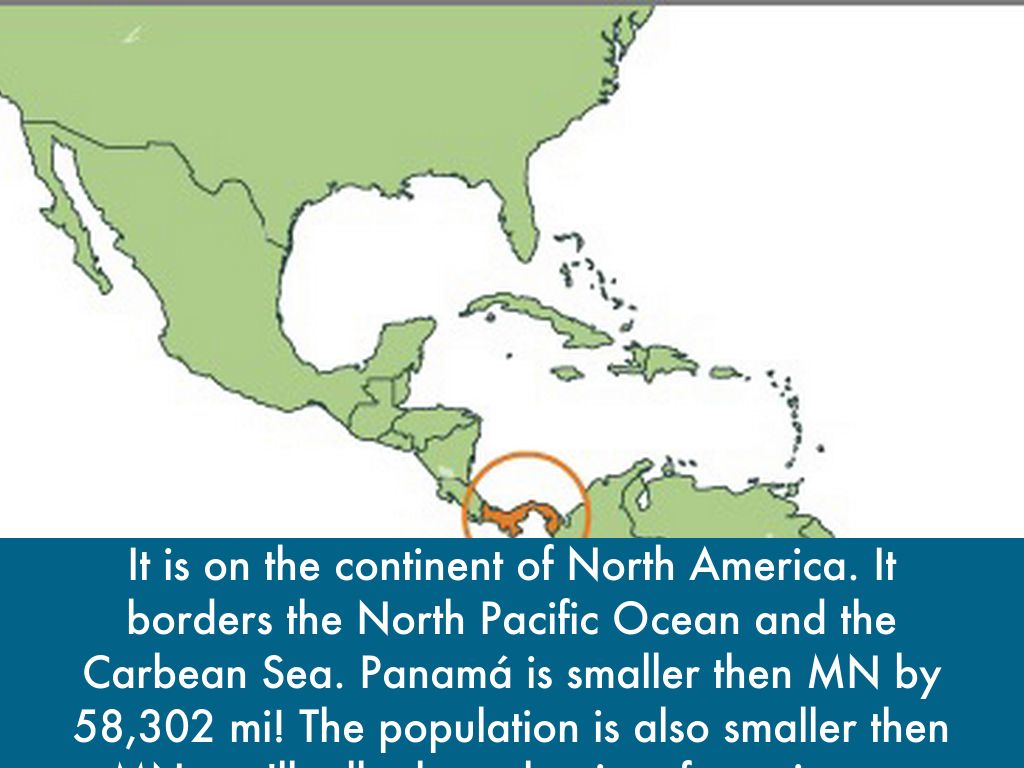 It is on the continent of North America. It borders the North Pacific Ocean and the Carbean Sea. Panamá is smaller then MN by 58,302 mi! The population is also smaller then MN, we'll talk about that in a few minutes, though.
