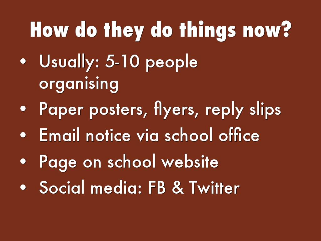 The school often supports them in sending out email notices, and lets them use the school photocopier to distribute flyers.