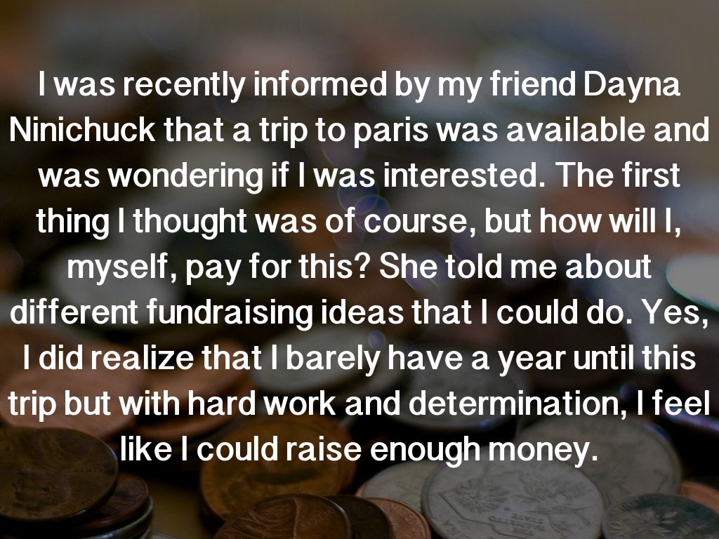 I was recently informed by my friend Dayna Ninichuck that a trip to paris was available and was wondering if I was interested. The first thing I thought was of course, but how will I, myself, pay for this? She told me about different fundraising ideas that I could do. Yes, I did realize that I barely have a year until this trip but with hard work and determination, I feel like I could raise enough money.