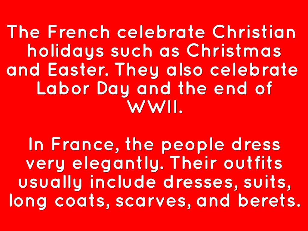 The French celebrate Christian holidays such as Christmas and Easter. They also celebrate Labor Day and the end of WWII.