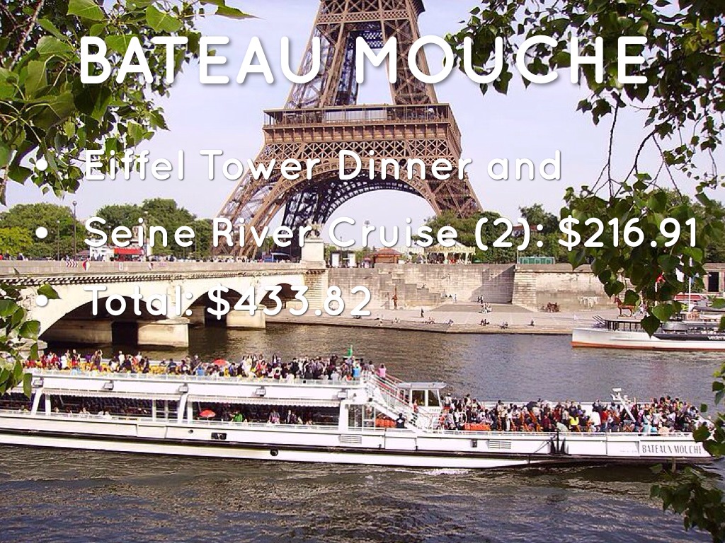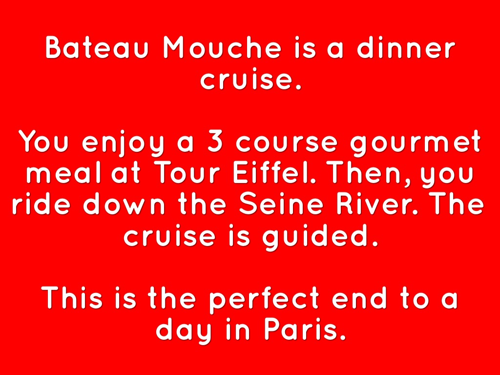 You enjoy a 3 course gourmet meal at Tour Eiffel. Then, you ride down the Seine River. The cruise is guided.
