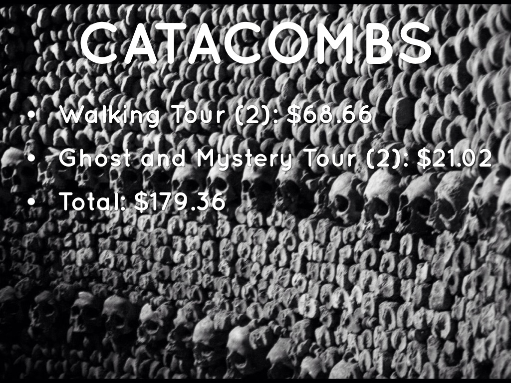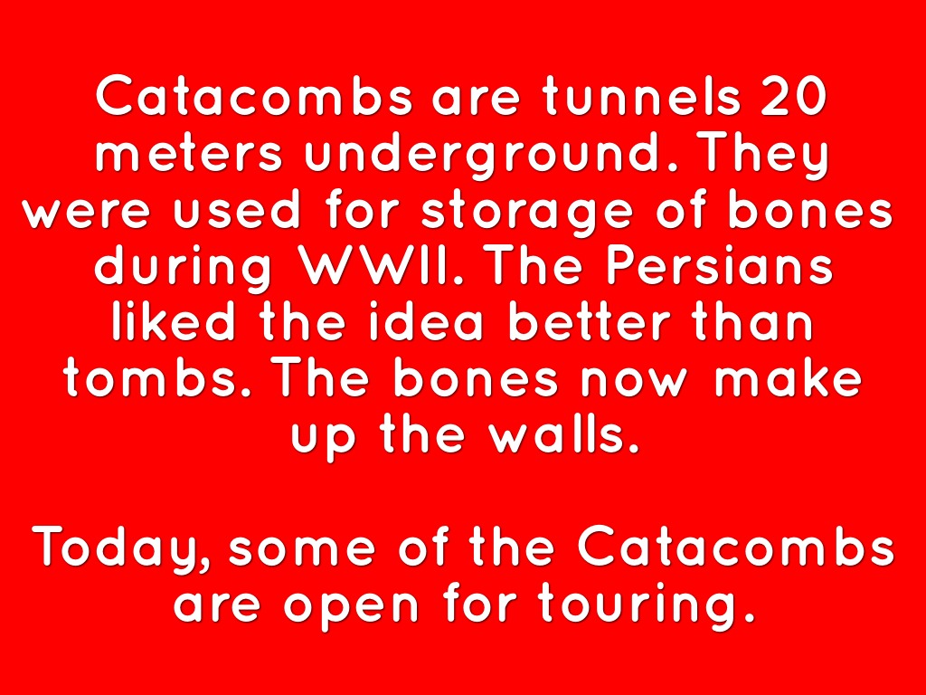 Catacombs are tunnels 20 meters underground. They were used for storage of bones during WWII. The Persians liked the idea better than tombs. The bones now make up the walls.