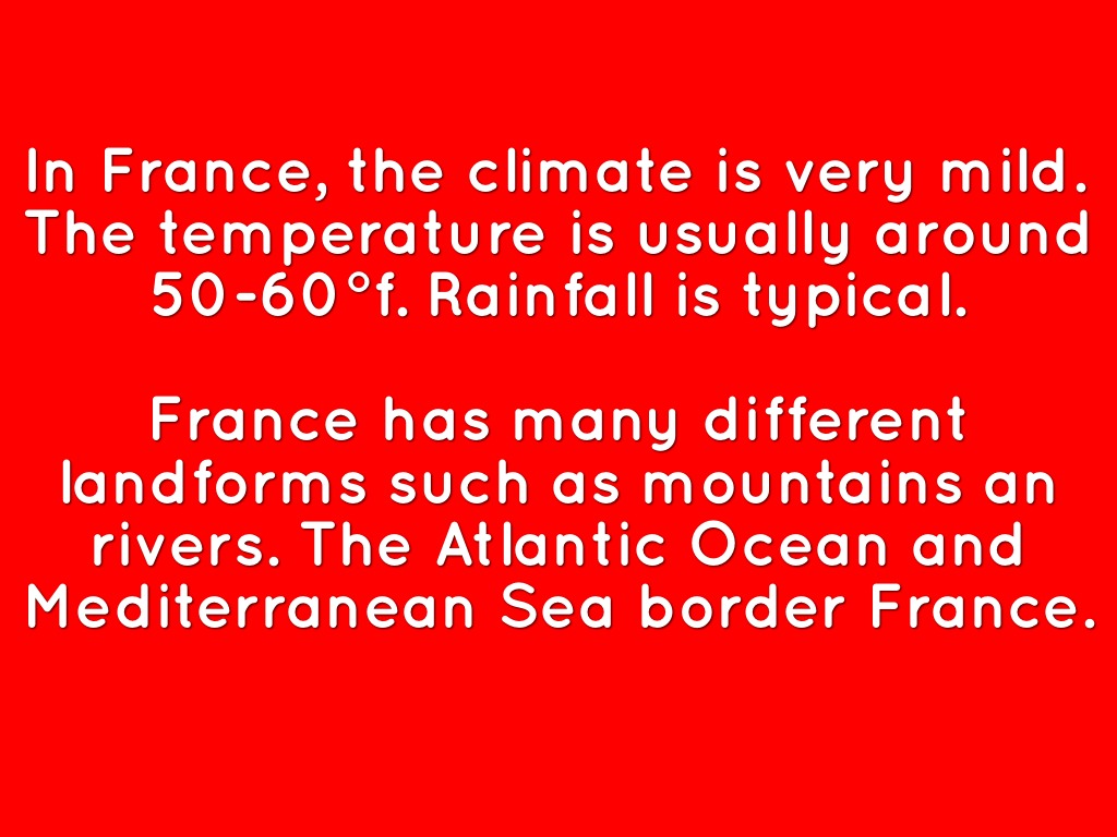 In France, the climate is very mild. The temperature is usually around 50-60°f. Rainfall is typical.