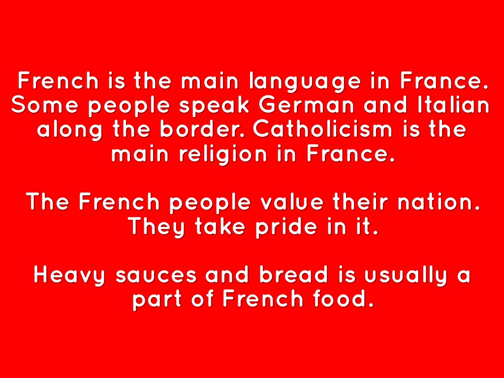 French is the main language in France. Some people speak German and Italian along the border. Catholicism is the main religion in France.