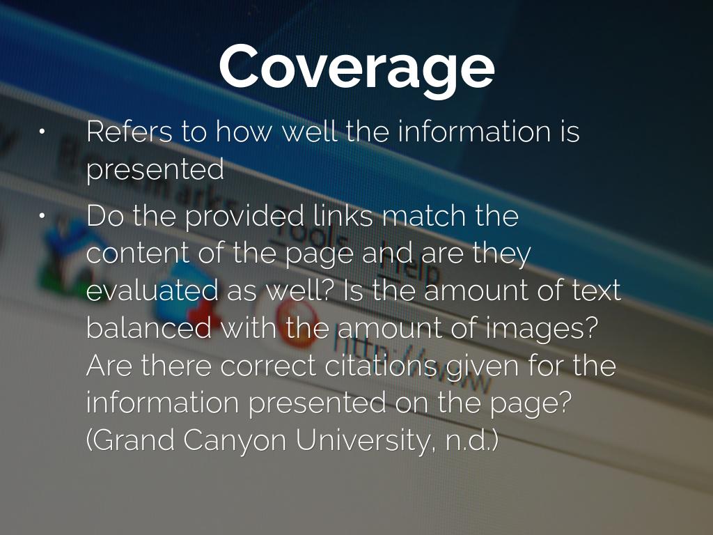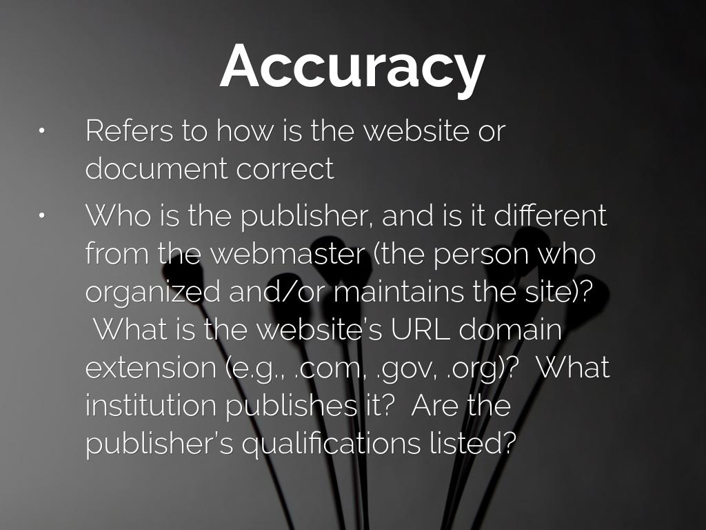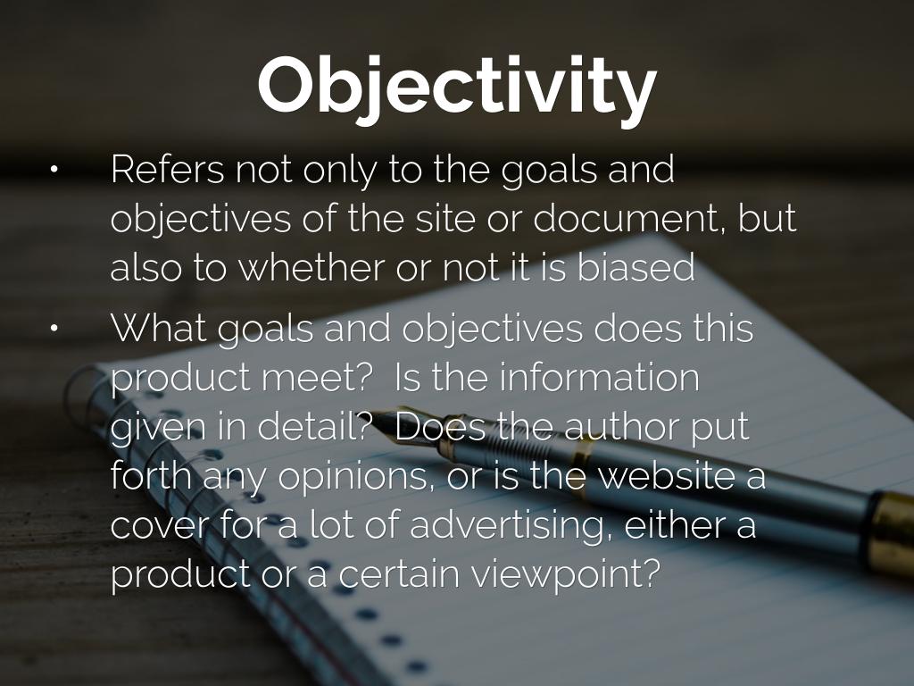 Refers not only to the goals and objectives of the site or document, but also to whether or not it is biased